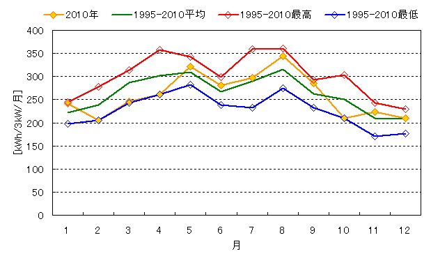 2010年の年間基準発電量(3kW換算)がまとまりました。 全国平均では前年と比べて1%の増加となりました。 地域別にみると関東が6%の増、沖縄が10%の減となりました。 他の地域は3%以内の増減です。